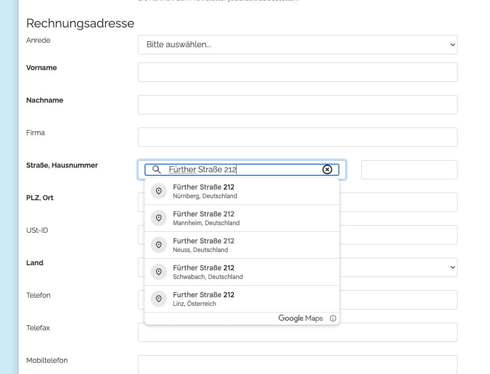 Automatisches Ausfüllen Alle Felder werden automatisch ausgefüllt (Straße, PLZ, Stadt, Land)