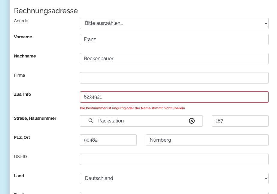 Postnummer-Prüfung Prüfung ob Postnummer zum Kundennamen passt