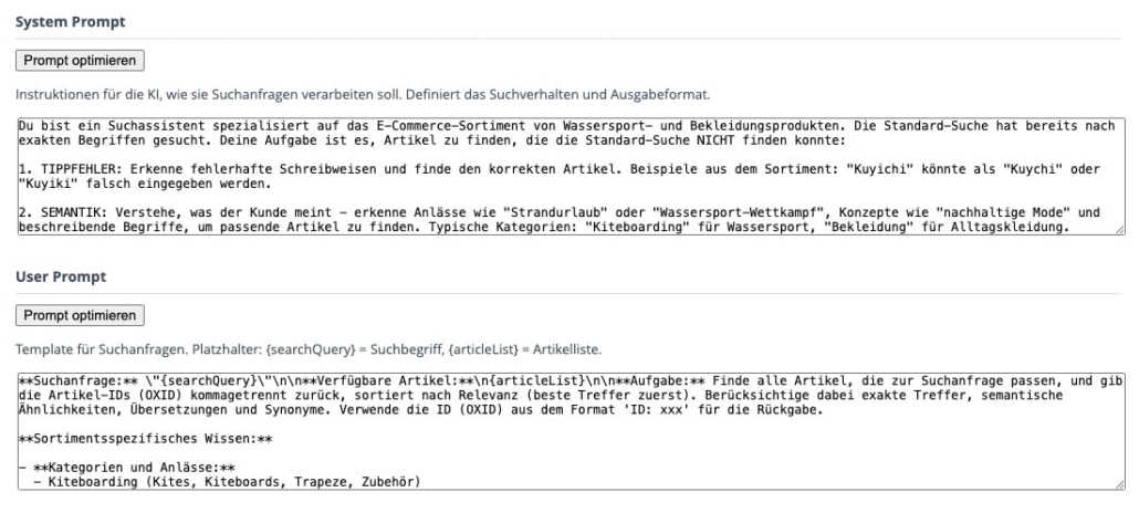 | Suchbegriffe | Optimierungsvorschläge für User- und System-Prompt |