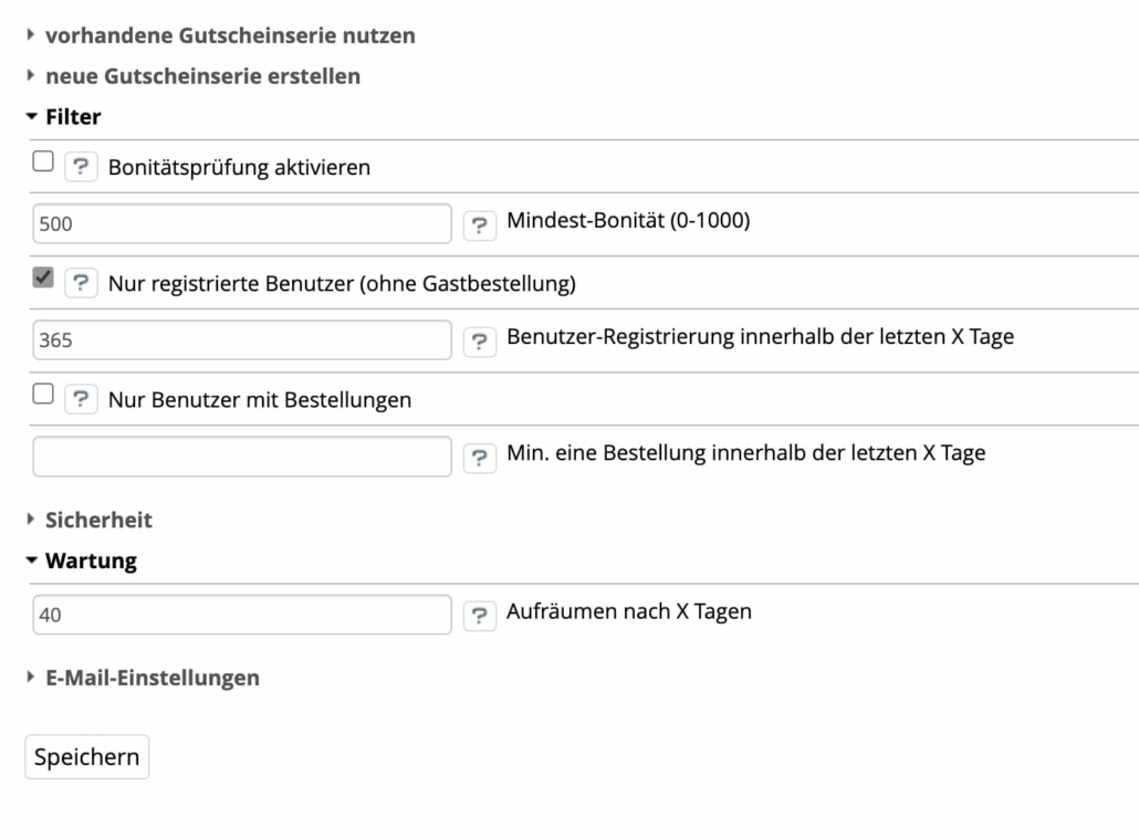 - Einstellung von Gültigkeitsdauer (in Tagen) und Mindestbestellwert